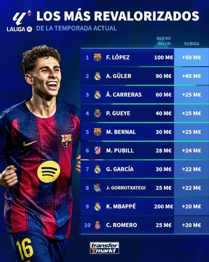 德转列本赛季西甲球员身价涨幅榜:费尔明暴涨5000万欧元第一
