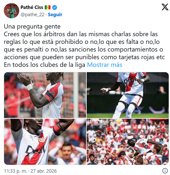 巴列卡诺球员帕特-西斯没有放过这个机会,他在自己的社媒方账号上发起了一场关于裁判的讨论。这位非洲球员在帖子中向粉丝抛出了一个问题:“在联赛开始前,你们认为裁判对西甲所有俱乐部进行的规则宣讲——比如什么是明令禁止的、什么是犯规、什么是点球、处罚尺度、以及哪些行为或动作会被处以红牌等——都是完全一样的吗?”在看到粉丝们的回答之前,西斯就已经提前给出了自己的看法:“我个人认为并非如此。”